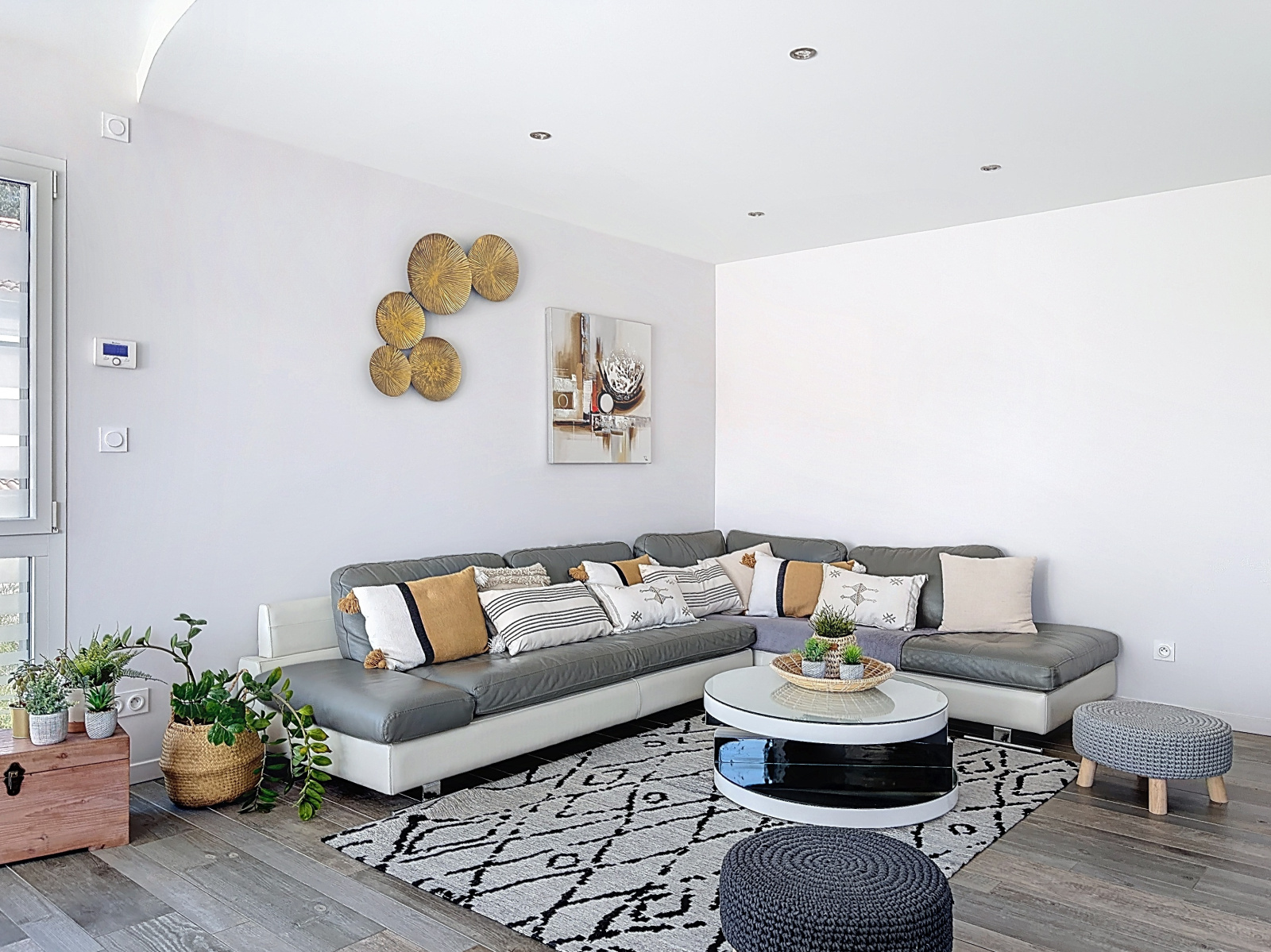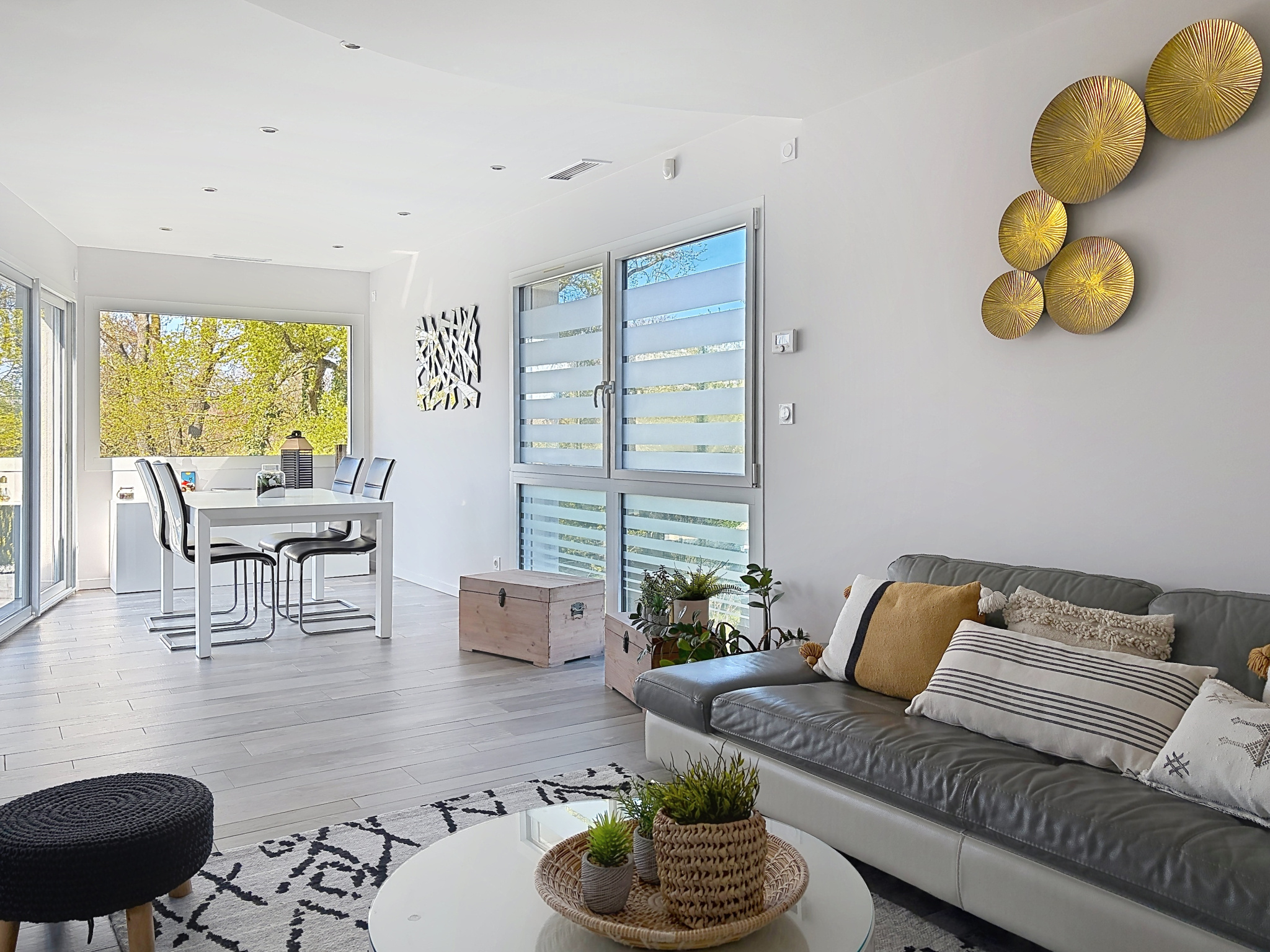 Chauffage au sol sur les 2 niveaux avec une chaudière gaz de ville. Climatisation réversible dans la pièce de vie. Huisseries en aluminium double vitrage et volets roulants motorisés avec une commande centralisée. Certains vitrages sont miroirs pour conserver son intimité, notamment dans les chambres, tout est bien réfléchi. DPE C.