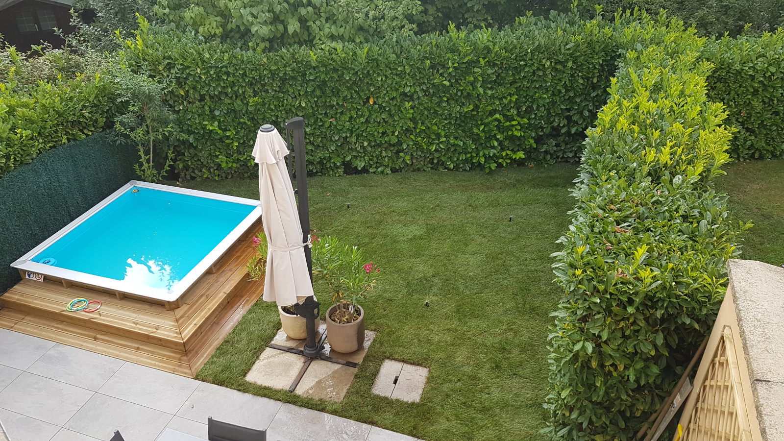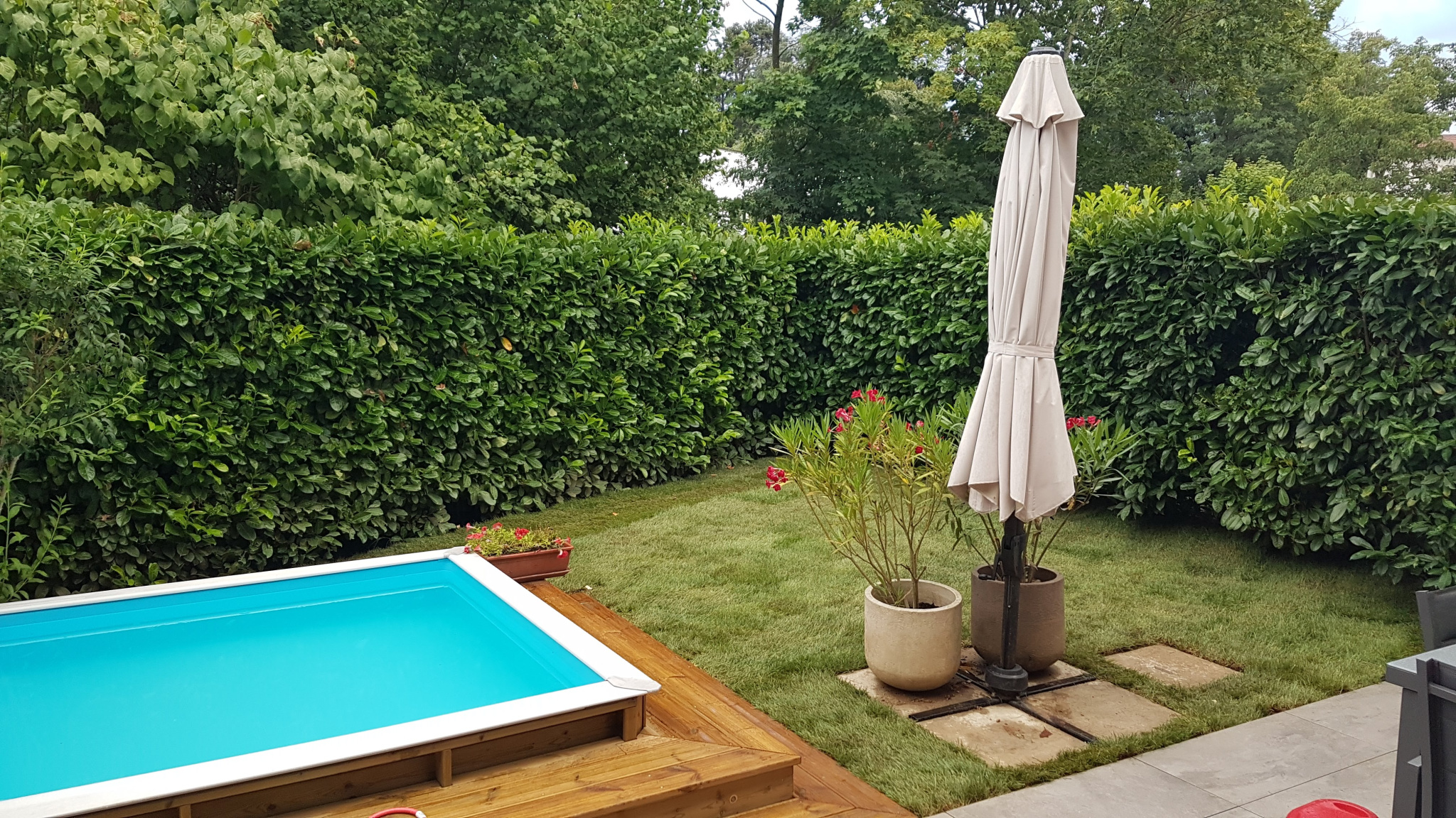 De plain pied, entrée avec placards, belle pièce de vie de 35 m2 comprenant une cuisine US entièrement équipée, un accès direct sur l'exterieur avec terrasse, bassin parfaitement intégré, entouré de pelouse.