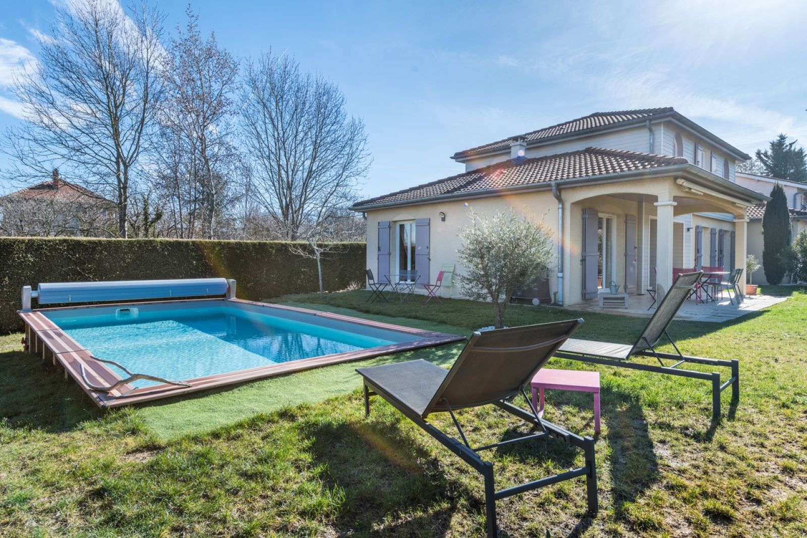 VENDU PAR L'AGENCE, FRANCHEVILLE LE HAUT, dans un environnement résidentiel, charmante maison de 156 m2 habitable, sur un terrain clos et arboré de 735 m2 avec piscine. Composée d'une belle pièce de vie de 45 m2 avec cusine US. Charpente traditionnelle apparente. 4 chambres avec placards dont 2 de plain pied. Salle de bains et salle d'eau. A l'étage spacieux espace mezzanine pouvant servir pour une salle de jeux ou un coin TV cosy. Chauffage gaz de ville sur le RDC et par climatisation réversible à l'étage. Buanderie. Garage. Bus C20 accessible à pied. Prix affiché frais d'agence inclus, honoraires charge vendeur. Votre contact : Caroline Chostak 07 60 36 26 09, Agence White immo 04 72 44 42 00