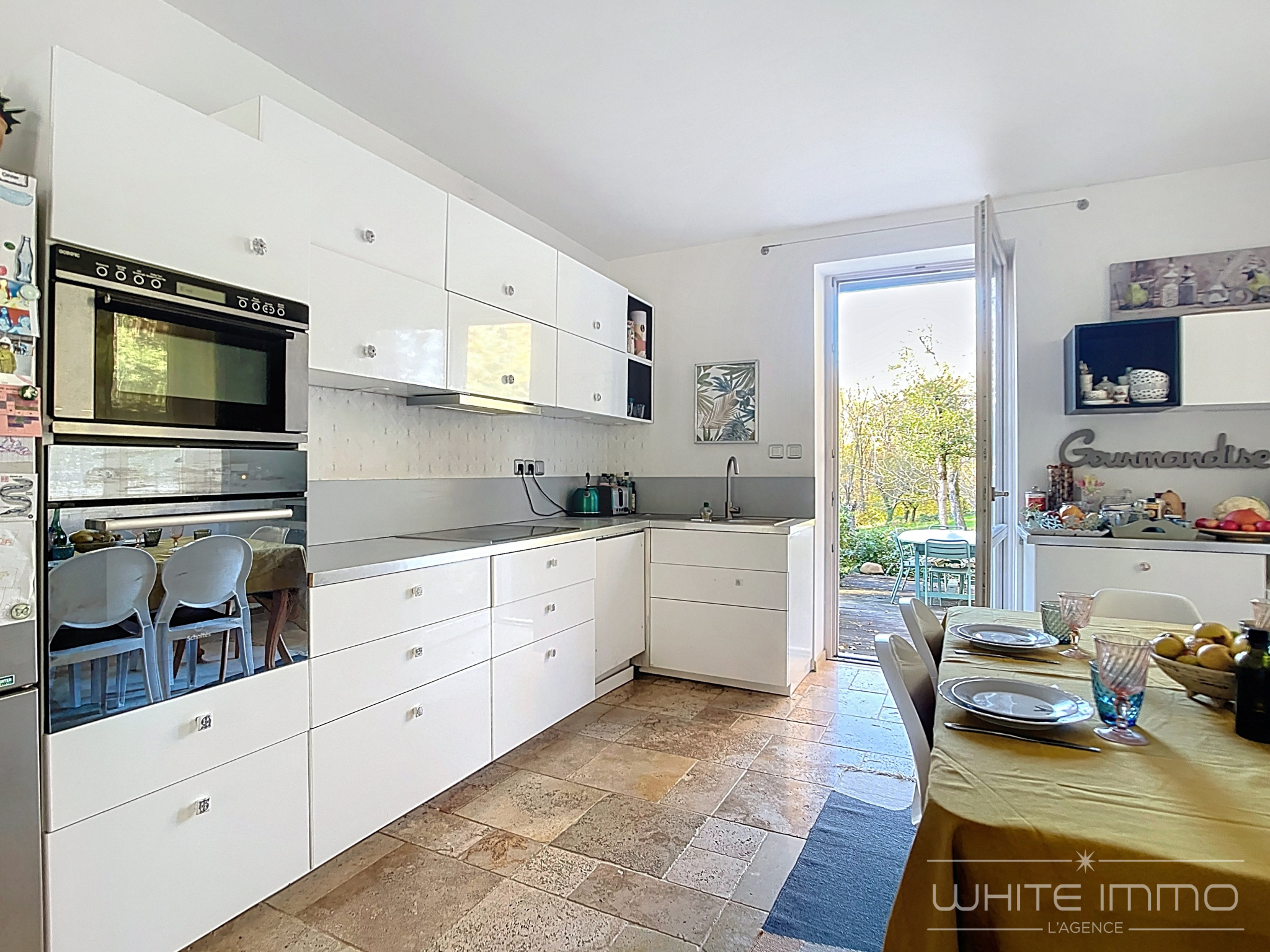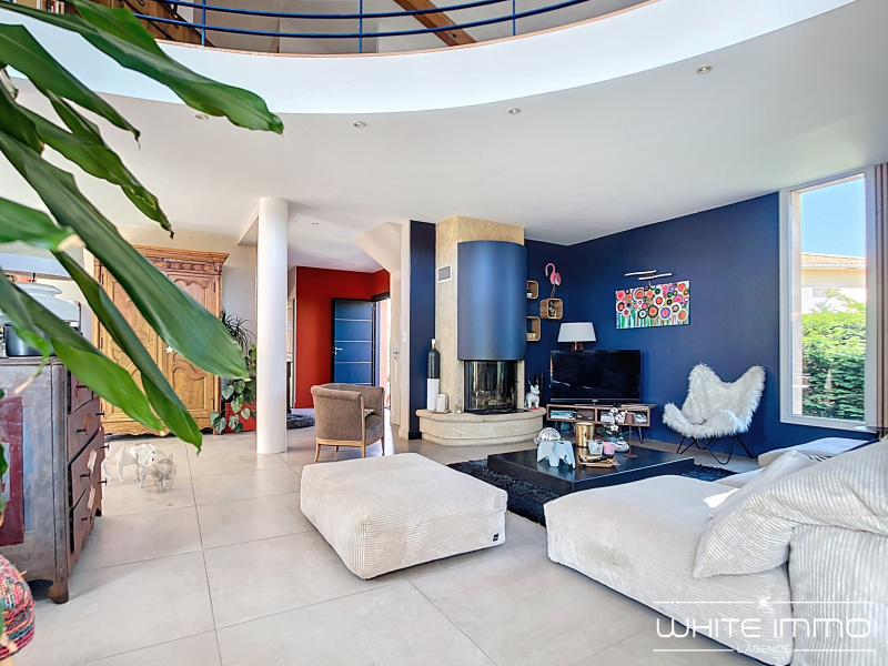 Grande cuisine entièrement équipée avec coin repas, accès sur 2 terrasses. dont 1 plein Sud Le salon est ultra lumineux avec sa cheminée. Les sols sont en travertins, et en parquet. La surface des ces pièces de vie est de 80 m2