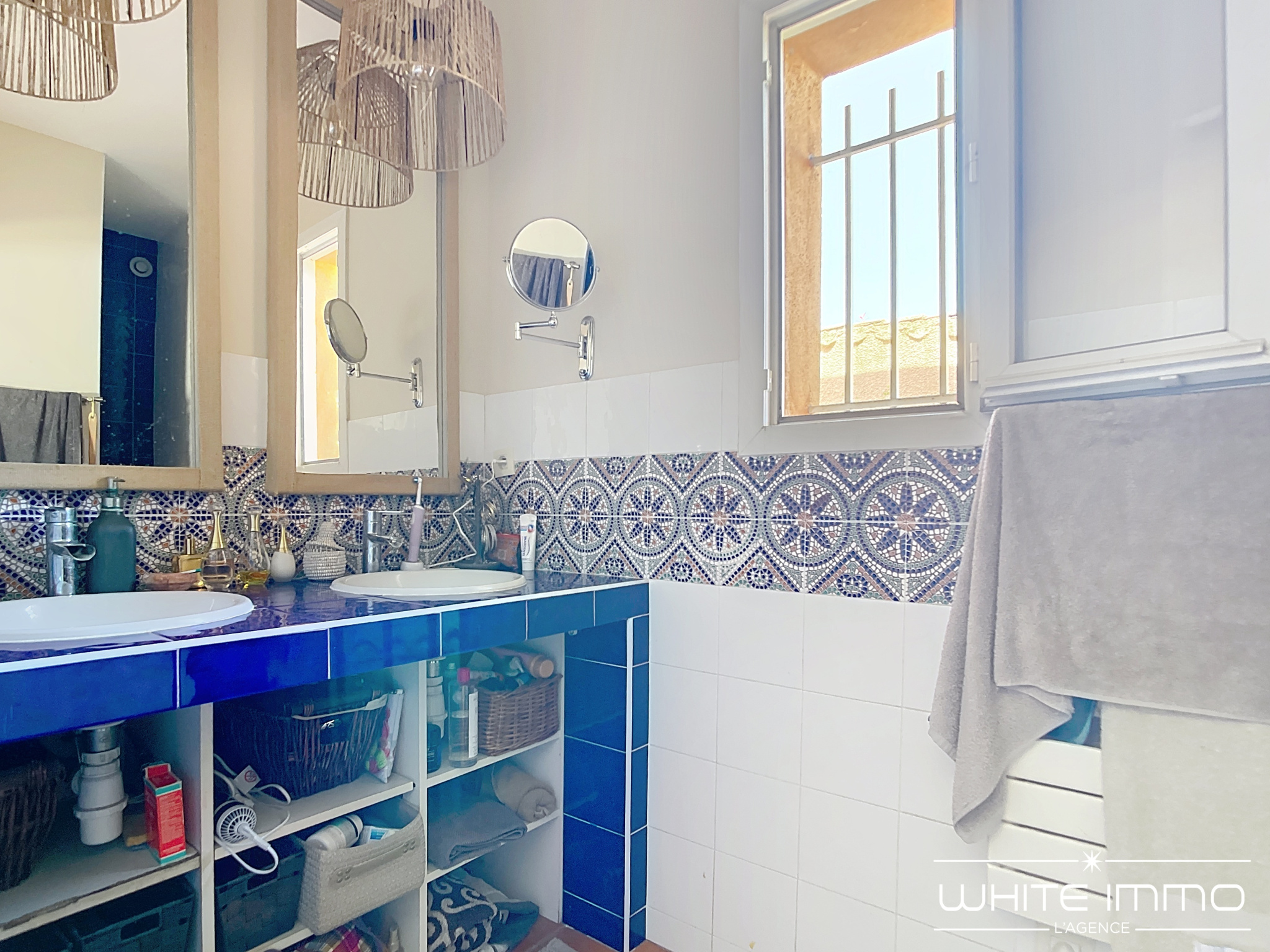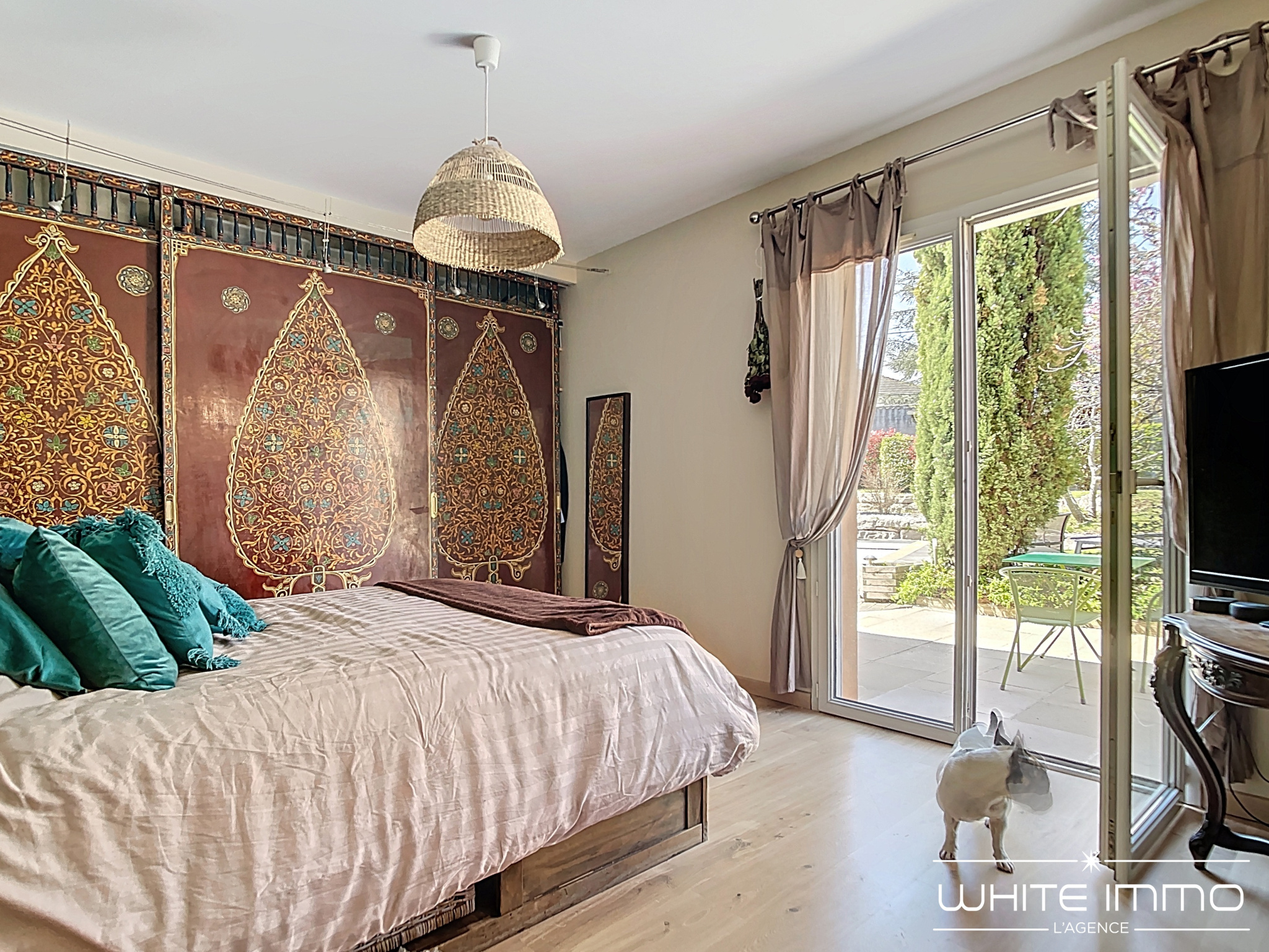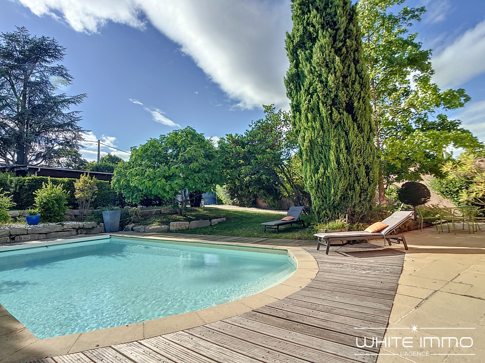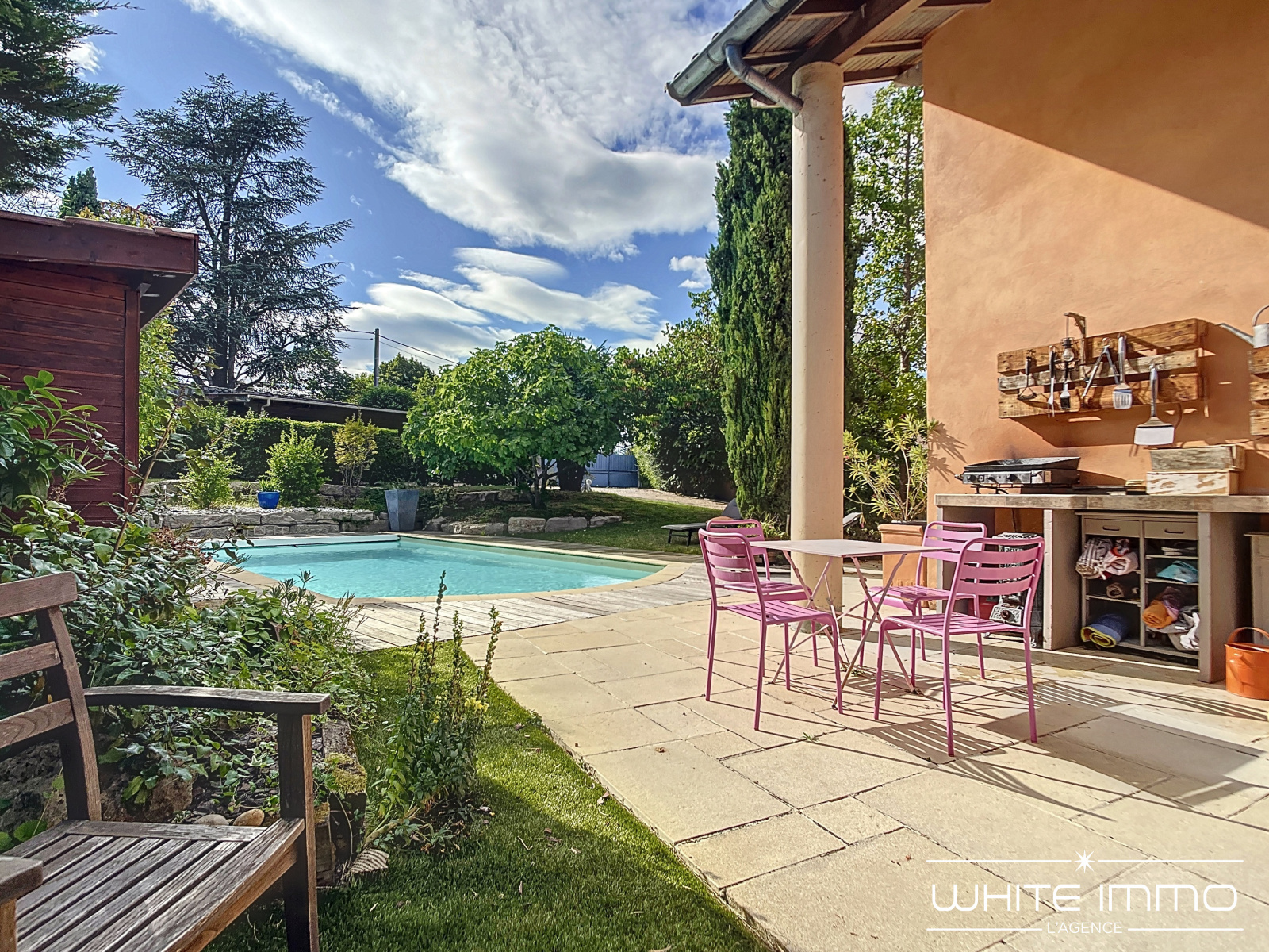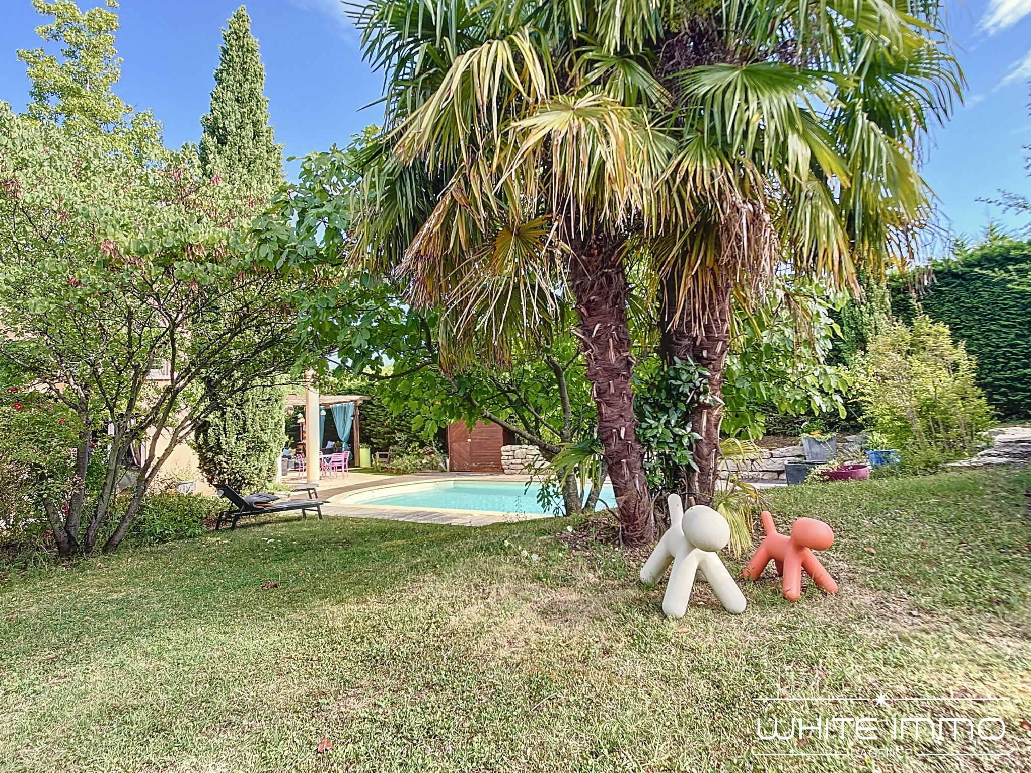 La piscine est traditionnnelle, 9x4,5m, chauffée et sécurisée par un volet roulant. Une cusine d'été ultra pratique à proximité immédiate. Jardin paysagé qui préserve de tout vis à vis, d'autant que la parcelle est en grande partie clos de murs. Portail motorisé.