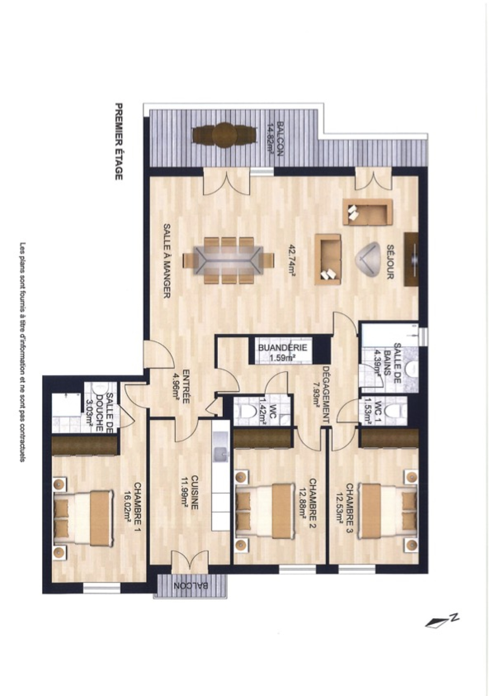 Les 3 chambres sont en parquet massif chêne, dont 1 chambre parentale avec salle d'eau. Nombreux placards dans toutes les chambres. (11,37 / 11,69 / 14,79 M2) toutes sont exposées à l'Est et une 2ème salle d'eau independante ainsi que 2 wc.