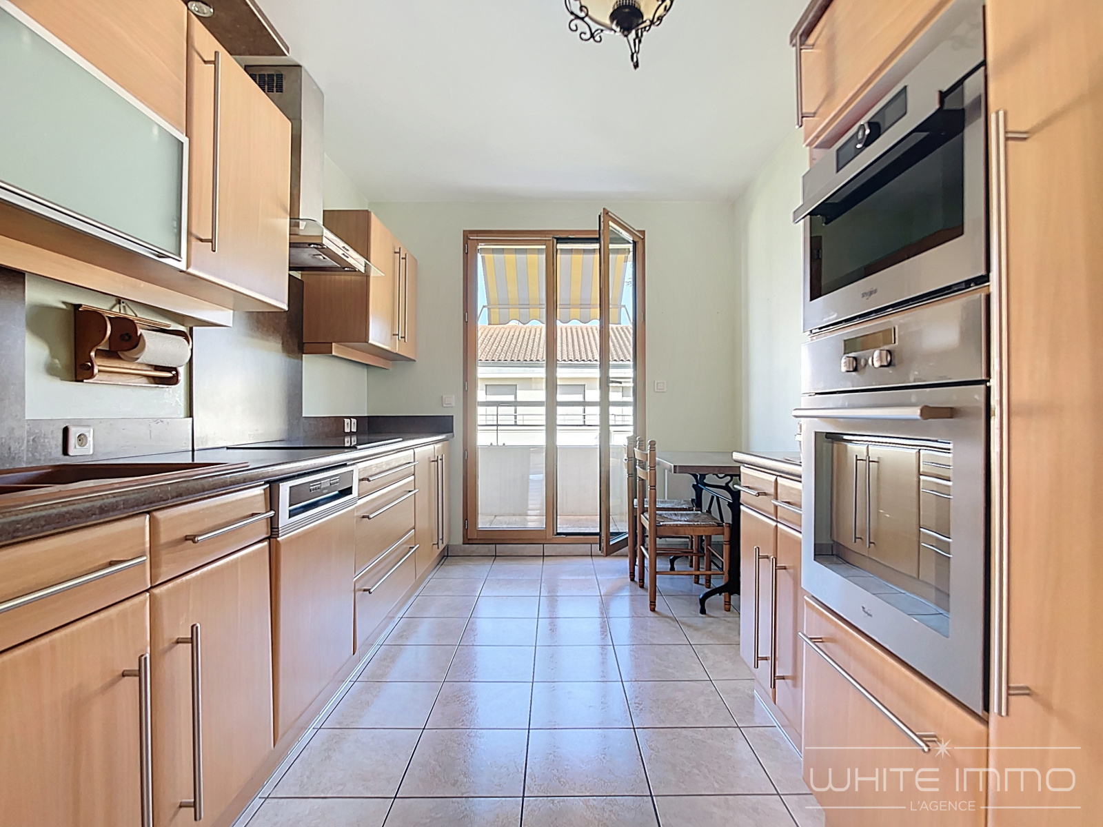 La cuisine est entièrement équipée avec un accès sur un balcon à l'Est.