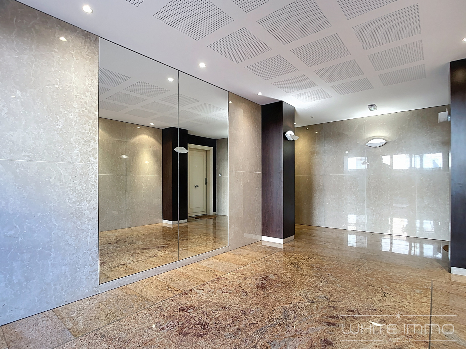 Très belle pièce de vie en marbre au sol d'une superficie de 48 M2 avec un accès sur la terrasse Sud/Ouest de 14 M2.