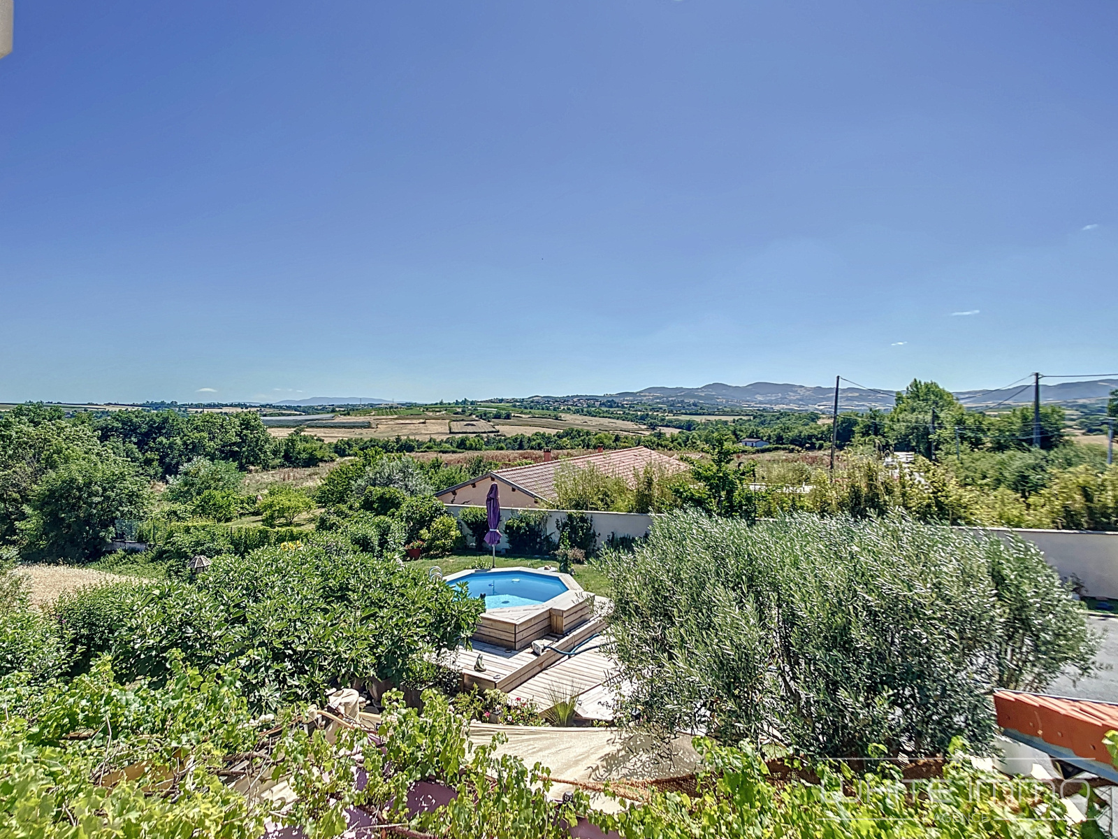 La cour permet de stationner plusieurs voitures, le portail est motorisé. La piscine récente est parfaitement intégrée avec des terrasses en bois et profite de la vue dégagée.