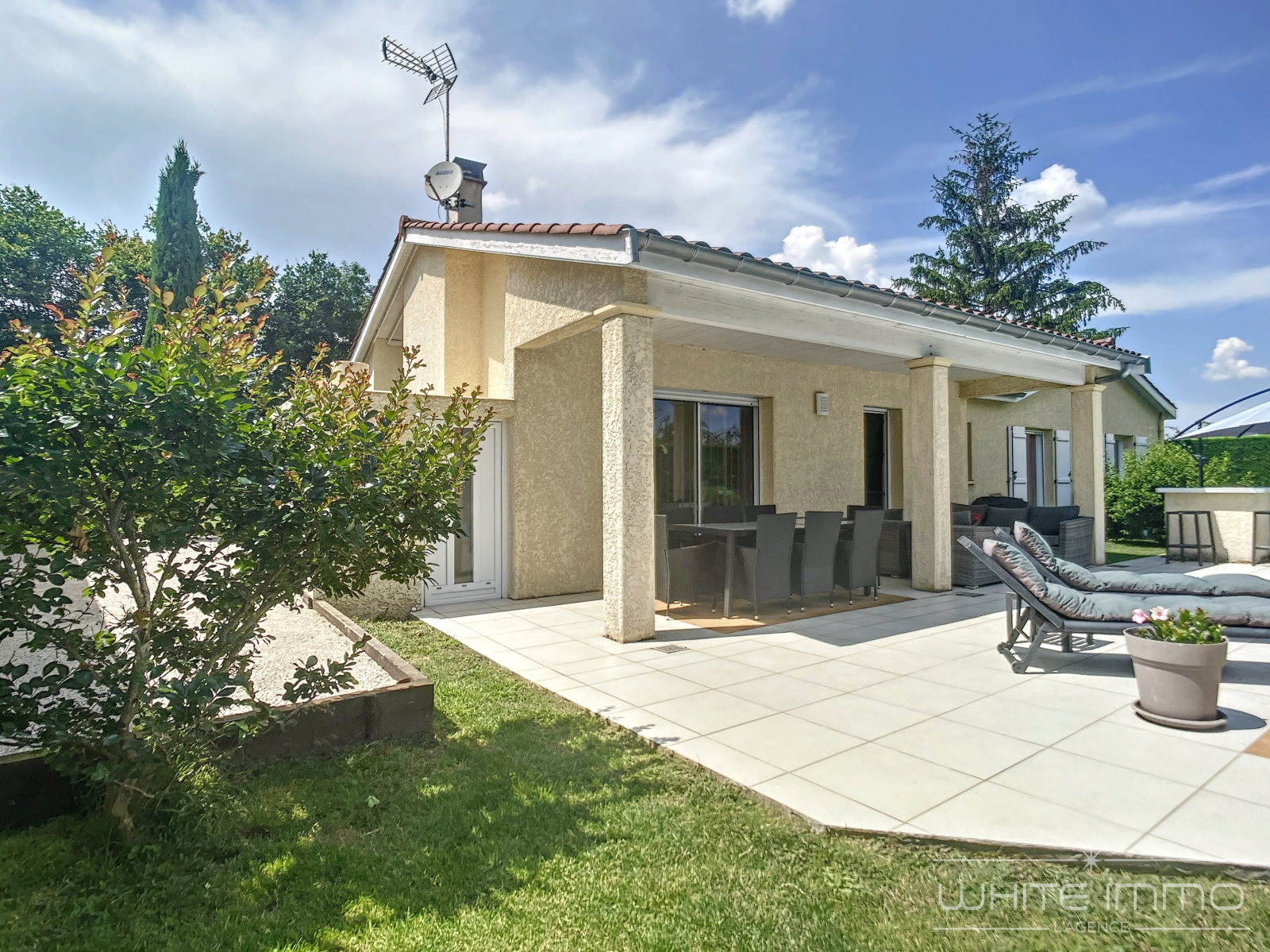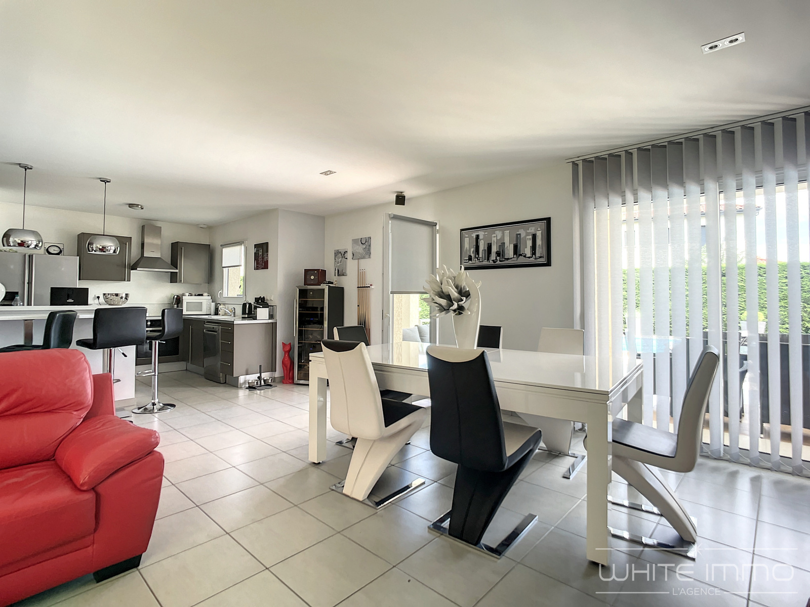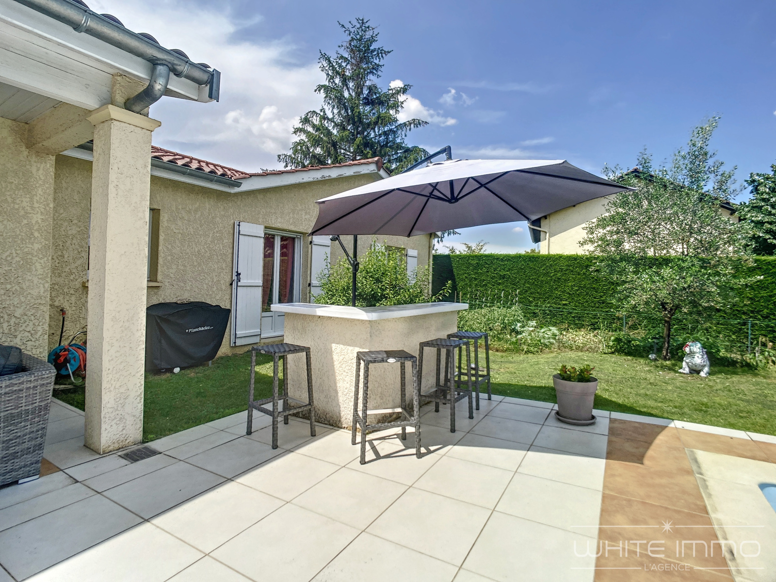 VENDU PAR L'AGENCE - BRINDAS, EXCLUSIVITE WHITE IMMO, Très jolie maison individuelle d'environ 100 m², sur une parcelle de terrain de 730 m², entièrement de plain pied, au calme tout en étant proche du collège. Belle pièce de vie traversante de 48 m² comprenant séjour, salle à manger (cheminée), cuisine (Mobalpa) entièrement équipée. 3 chambres ( 11,85 / 12 / 12,37 m²). 1 grande salle d'eau. Huisseries double vitrage PVC. Volets roulants électriques et volets bois. Chauffage au sol dans la pièce de vie et radiateurs dans les chambres (gaz de ville). Garage de 46 m² + 2 places de stationnement devant le garage. Portail motorisé. Piscine 8 X 4 au chlore. Terrain de pétanque. 2 terrasses abritées. Terrain de 730 m² clos et arboré. DPE : C. Notre avis : "une maison facile à vivre". Prix affiché, frais d'agence inclus (honoraires charge vendeur). Votre contact : Sandrine Vacher White Immo l'Agence 07 60 36 34 04. Nom de code à donner : "Fanny"