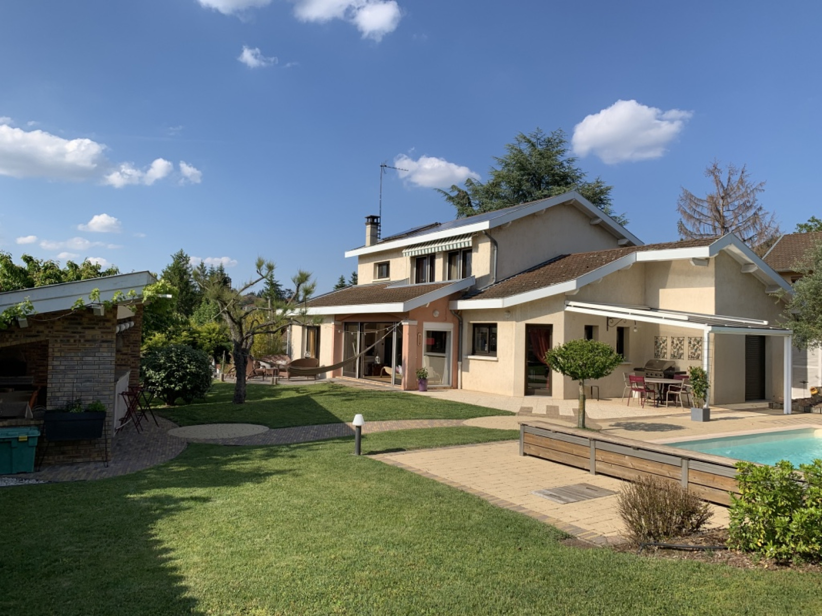 VENDU PAR L'AGENCE - CRAPONNE, idéalement située, à 400m du centre et de toutes les commodités, au calme absolu, sur un superbe terrain paysagé de 1660 m2 clos, avec piscine, maison d'architecte d'environ 220 m2 avec nombreuses dépendances. En enfilade, belle et lumineuse pièce de vie avec grandes baies coulissantes donnant sur le jardin, cheminée. Cuisine équipée US ou indépendante (porte à galandage) avec cellier attenant . 5 chambres + bureau. 1 salle d'eau et 3 salles de bains. Garage avec partie atelier, local technique, cave à vins, immense préau. Charmant pool house aménagé (bar, four à pizza, ...). Maison parfaitement entretenue, double vitrage, panneaux photovoltaïques (revenus d'environ 1700 euros/ an) et solaires. DPE en attente. Prix affiché frais d'agence inclus (honoraires charge vendeur). Votre contact : Caroline CHOSTAK 07 60 36 26 09 White Immo l'Agence : 04 72 44 42 00