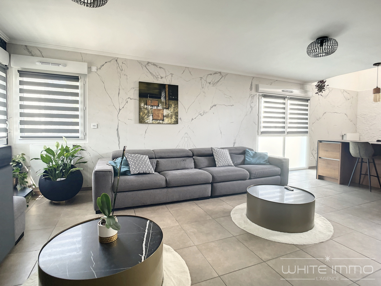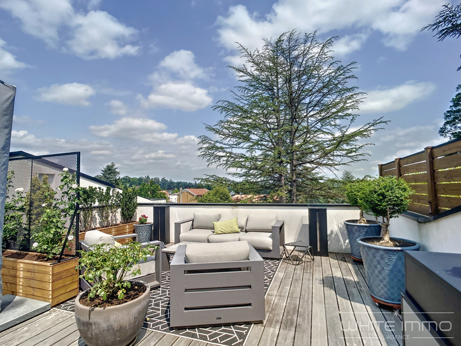 VENDU PAR L'AGENCE. CRAPONNE, DPE : B Limite Francheville, Rare, appartement T4 DUPLEX, de 88,34 m2 avec terrasse de 43 m2 dans un parc classé en retrait de la route entièrement au calme. Très bel appartement ultra contemporain avec une belle pièce de vie de 42 m2 comprenant un séjour et une superbe cuisine entièrement équipée. A l'étage, 2 chambres d'environ 12 m2 avec chacune 1 dressing. 1 salle de bains et 1 salle d'eau. 2 wc. A l'abri des régards, une terrasse de 43 m2 style "Tropézienne". 1 garage en sous-sol, et 1 place de parking privative complètent ce bien. Commerces et transports en commun à 2 pas. DPE : C. Notre avis : produit Coup de coeur, avec un effet "maison sur le toit". Prix affiché frais d'agence inclus (honoraires charge vendeur). Votre contact : Sandrine Vacher White Immo l'Agence 04 72 44 42 00. Nom de code à donner pour tout renseignements : Séquoïa